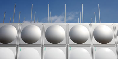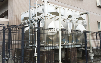ビルやマンション等では、水道管を通って送られてきた水を一旦水槽に貯めて、ポンプを使って建物の利用者へ供給しています。