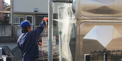貯水槽の状況(破損・漏水の有無)、設備や機器の状況(故障・不備の有無)、周辺の衛生状況の確認をし、水槽外部や周辺の清掃を行います。