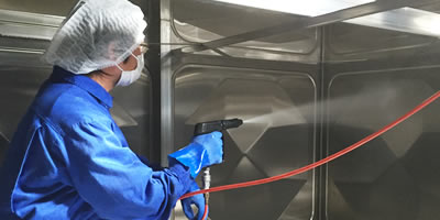 清掃をした水槽内部に消毒薬を噴霧し消毒を行います。